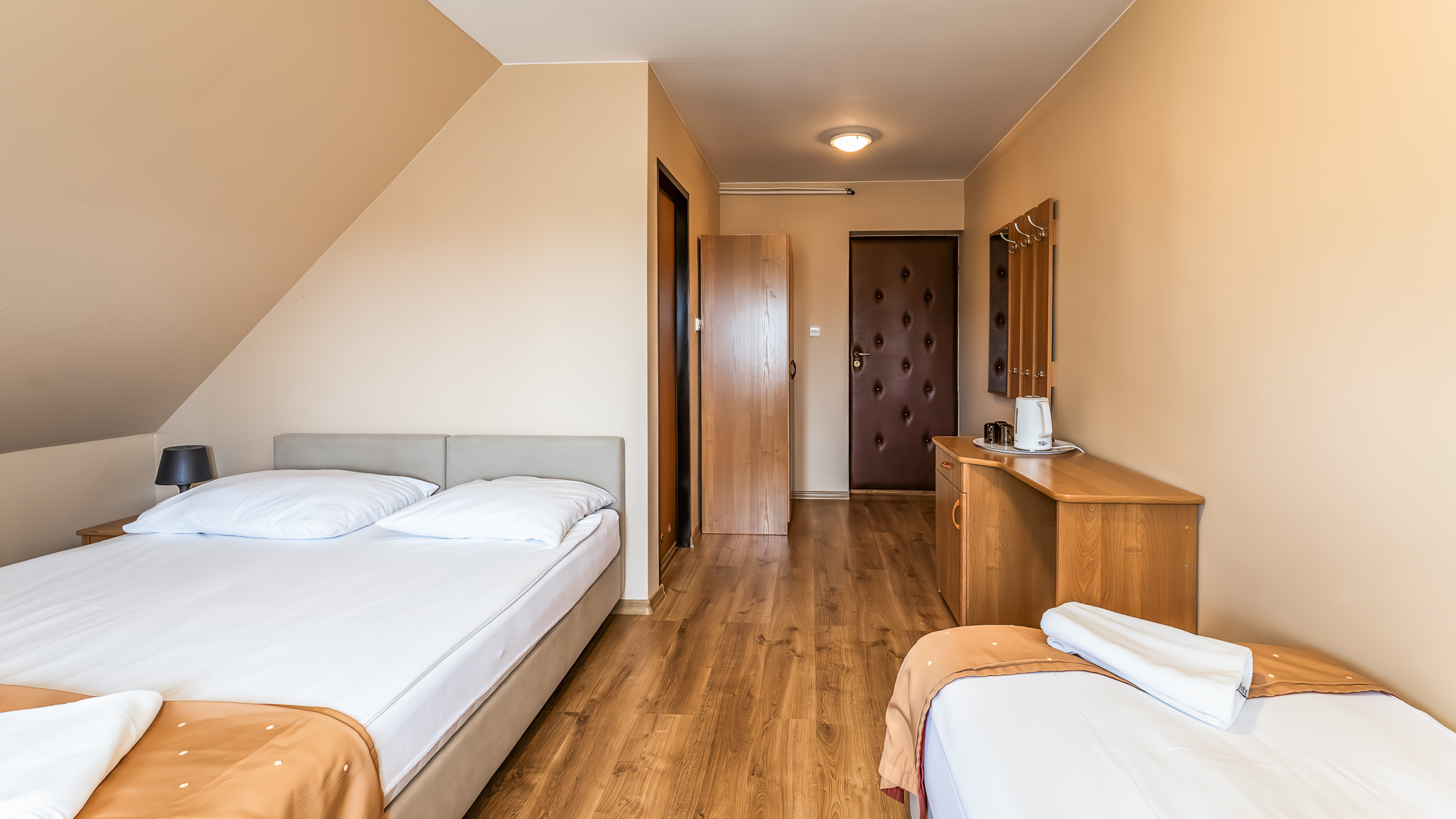 Wszystkie pokoje posiadają standardowe łóżka hotelowe, które można dowolnie łączyć lub rozdzielać, dostosowując układ do indywidualnych potrzeb.